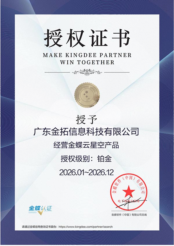 在广东东莞,本地化服务尤为关键。广东金拓信息科技有限公司凭借专业实力,荣获金蝶铂金级别授权,并先后摘得“精英伙伴”“卓越领航伙伴”等多项荣誉,实力与口碑双认证。